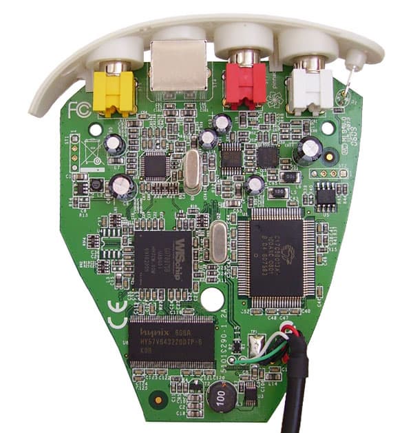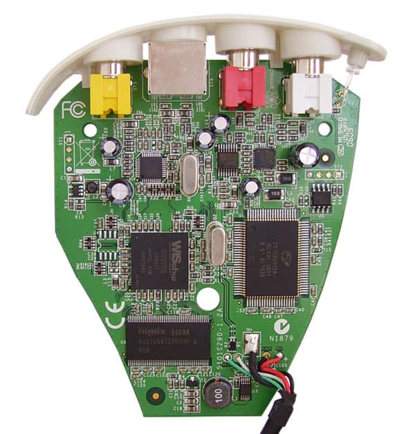 Входы, расположенные на белой передней панели, стандартны для всех таких аппаратов. Слева от входов приютился зеленый светодиод, загорающийся при подключении устройства к компьютеру. Качественная отливка корпуса чуть не сорвала коварные планы по разборке устройства. Пластиковые половинки накрепко сцеплены между собой внутренними защелками; для пущей безопасности (и гарантии, думается) венчает сцепку единственный винт, спрятавшийся под наклейкой со штрих-кодом. Но корпус вскрыт, и пора вписывать новую строчку в известную детскую песенку "Из чего же, из чего же...".