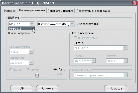 В чем же может ошибиться владелец устройства, обладающего способностью аппаратного кодирования? Типичная и наиболее часто встречающаяся ошибка при захвате — это выбор такого формата видео, который не поддерживается аппаратным кодировщиком. Невозможно заставить микросхему работать в режиме, отсутствующем в списке ее способностей. Большинству это покажется совершенно очевидным, однако неискушенный новичок может и не догадываться о существовании таких ограничений. К счастью, пакет Studio 10 QuickStart не позволит человеку, имеющему мало опыта в обработке видео, выбрать формат, не поддерживаемый устройством.
