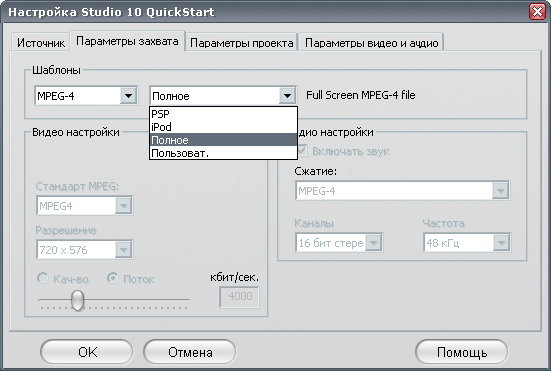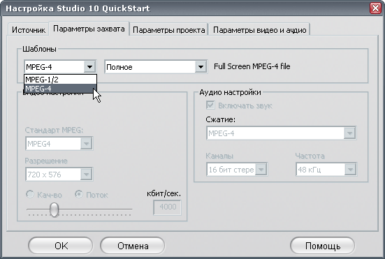 Поскольку производитель делает упор на возможность данной модели аппаратно кодировать видео не только в обыкновенный MPEG, но и в MPEG-4, было бы преступлением не попробовать это сделать. Итак, выберем в Studio 10 QuickStart нужную нам предустановку.