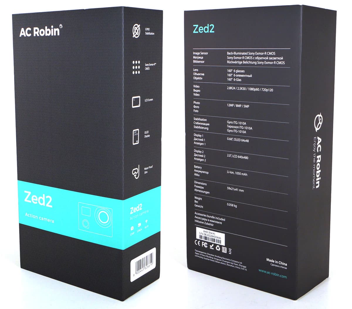 Упаковка, в которой поставляется камера, нетрадиционна для экшн-камерных. Нет здесь ни прозрачного колпака, под которым гордом виднеется камера, ни коробки-постамента с многочисленным или не очень набором аксессуаров. Зато информации, напечатанной со всех сторон упаковки, более чем предостаточно. Здесь на русском языке представлены основные и подробные технические характеристики камеры.