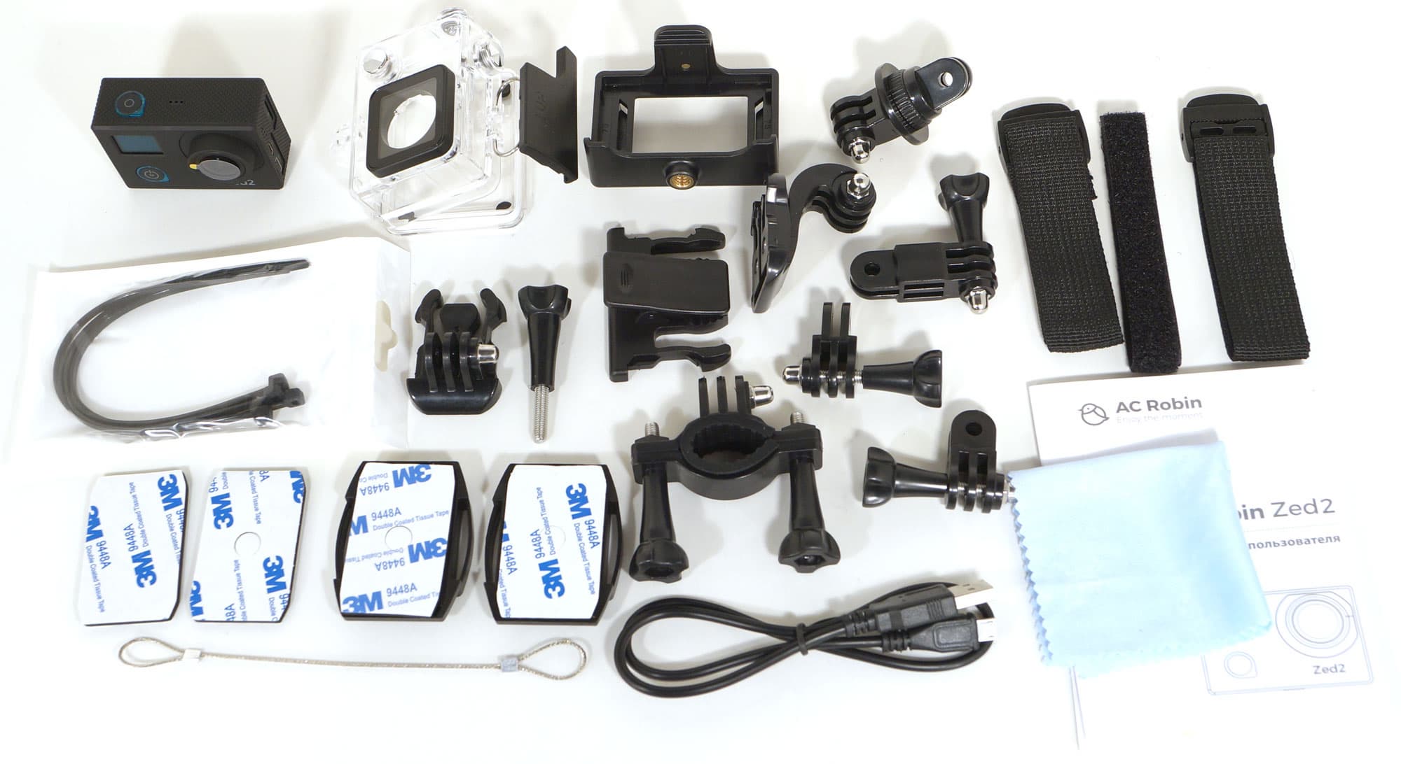 Отметим богатейшую комплектность камеры — пожалуй, здесь представлены аксессуары и крепления для всех случаев съемки, в любых условиях: под водой, с велосипеда, шлема, в салоне автомобиля и т. д. Дополняют комплект салфетка для протирки объектива и краткое руководство пользователя на русском языке.