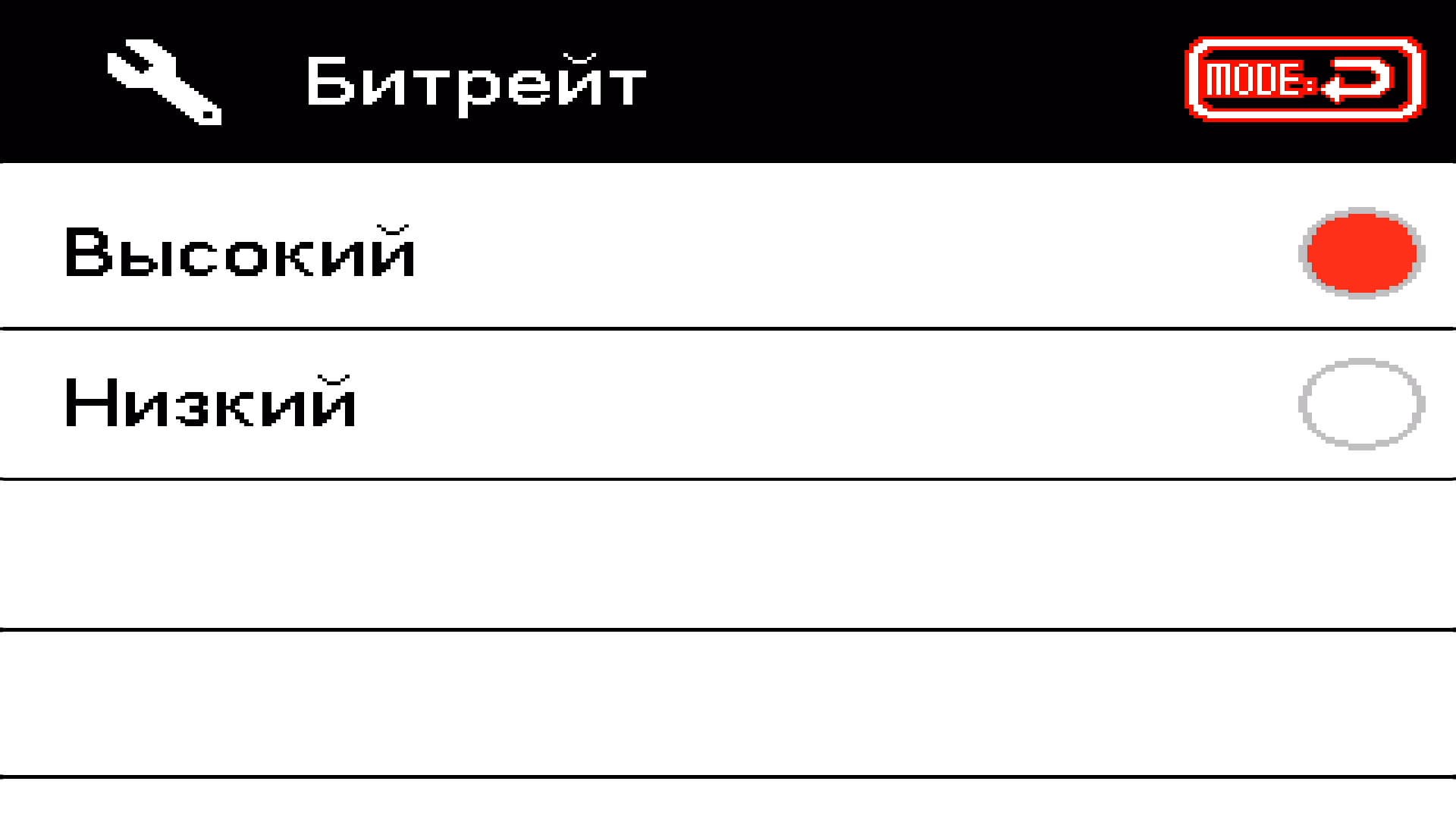 В камере имеется еще одна настройка, касающаяся формата записи: уровень битрейта. Здесь представлены два варианта: высокий и низкий уровень.