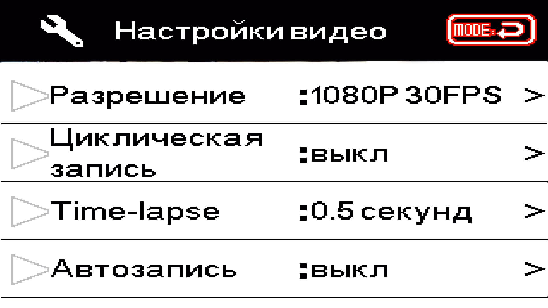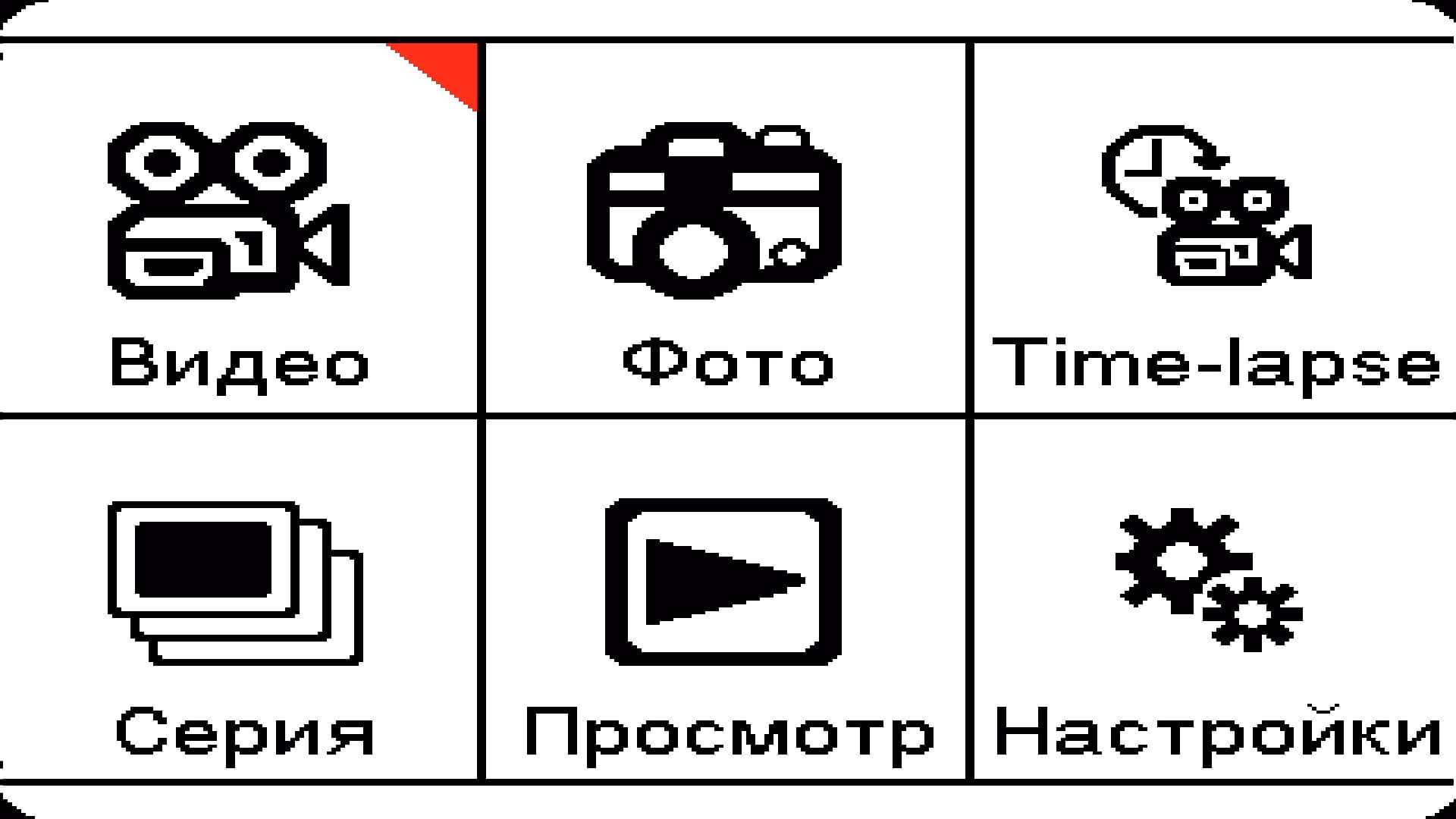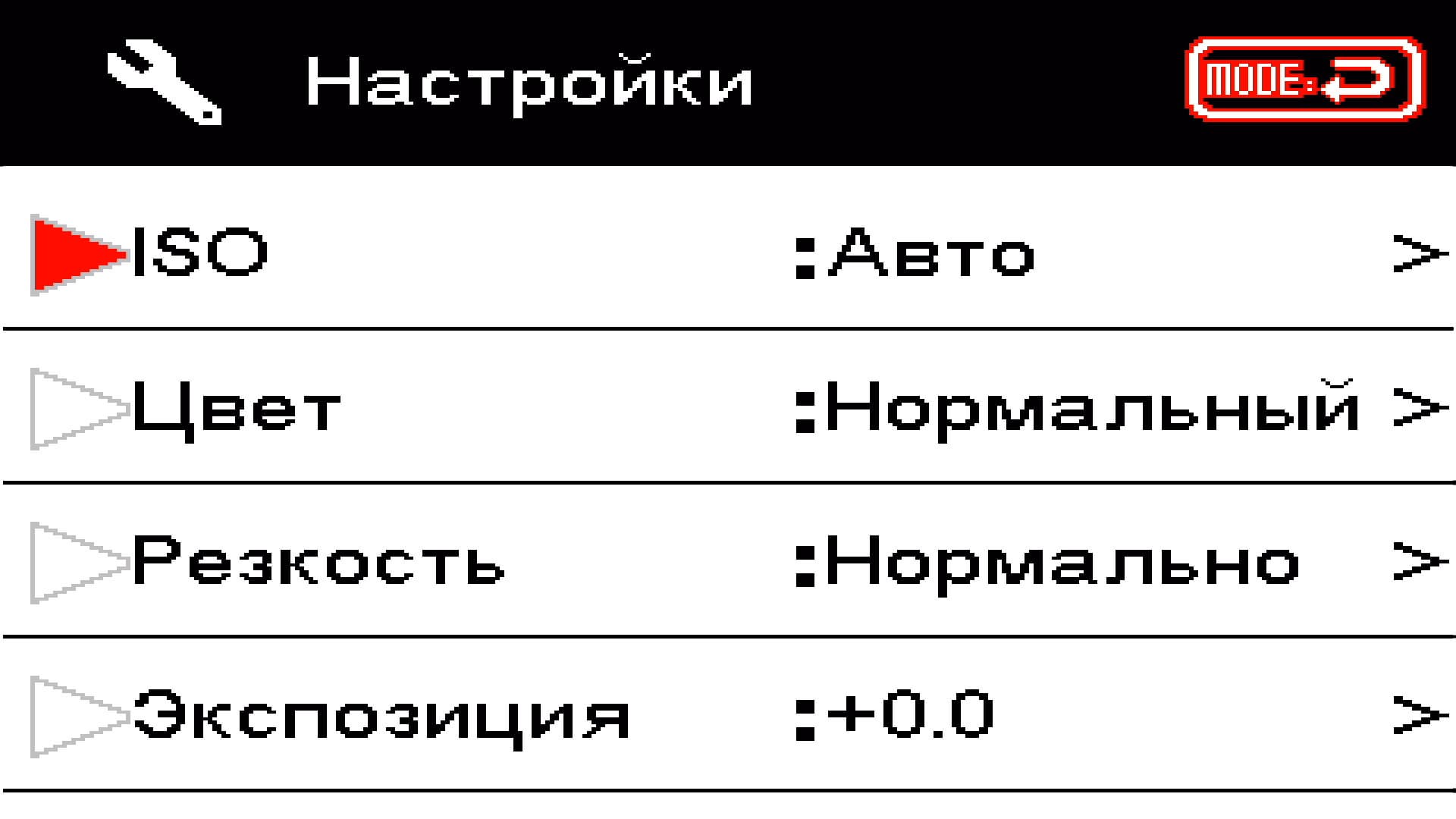 Второе меню открывается боковой кнопкой Вперед и содержит параметры, относящиеся к конкретному выбранному текущему режиму работы: Видеосъемка, Фотосъемка и т. д.