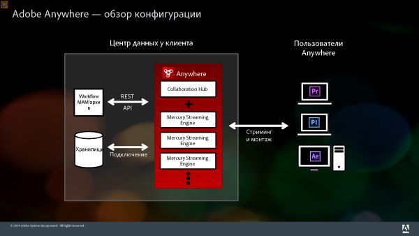 Так как Adobe Anywhere является серверной технологией, проиллюстрировать работу лучше всего с помощью слайдов презентации. Сразу скажем, что Adobe Anywhere — это не публичный облачный сервис. Adobe Anywhere ставится на физические сервера заказчика, а весь контент надежно защищен от посягательств. Скорее, это такое корпоративное облако, с контролируемым доступом из локальной и глобальной сети. Предусмотрены как готовые типовые варианты развертывания, так и интеграция в существующую сложившуюся систему заказчика. Специальный API позволяет решать разные нестандартные задачи, но это больше проблема компании-интегратора, а не заказчика.