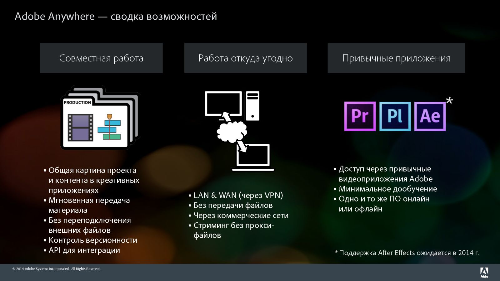 В текущий исторический момент Adobe Anywhere рассчитан только на самых крупных клиентов — кинокомпании и телевещание, а также требует бо́льших инвестиций, нежели обычная покупка лицензий ПО Adobe. Однако у Adobe Anywhere практически нет серьезных конкурентов, а идеи, заложенные в этот продукт, на самом деле востребованы для очень широкой массы профессиональных пользователей. Очень надеемся, что после того, как прогресс «проплатят» компании уровня CNN и BBC, наработки спустятся чуть пониже. Отрадно, что Adobe Anywhere развивается семимильными шагами, а бета-тестерами выступают лучшие мировые специалисты. На российском рынке также появились первые довольные пользователи этой системы, которые начали с минимального варианта внедрения Adobe Anywhere, но уже обрели аппетит и требуют «продолжения банкета».