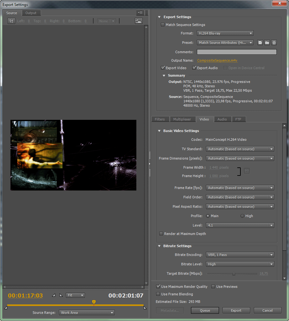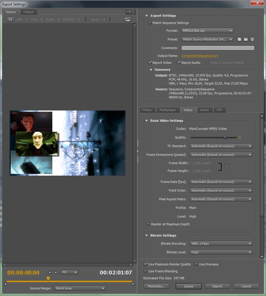 Перейдём к кодированию. К счастью, в новой версии программы Adobe здорово помогла пользователю, неискушённому в хитростях с разрешением, частотой кадров, и прочими интерлейсами. Каждый формат видео, предназначенный для конечного использования (FLV, H.264 Blu-ray, MPEG2 Blu-ray и MPEG2-DVD), теперь имеет несколько чертовски полезную предустановку. Называется она Match Source Attribute, что означает максимально точное соответствие характеристикам оригинала. При выборе такой предустановки кодировщик автоматически подберёт все нужные значения для будущего файла, так, чтобы сохранить исходные частоту кадров, соотношение сторон и т.д.