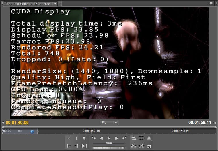 Теперь остаётся лишь наблюдать. Нажатием кнопки Play в окне Monitor запускается воспроизведение таймлинии, при этом технические данные в реальном времени отрисовываются поверх проигрываемой картинки. Заголовки OpenCL Display и CUDA Display обозначают работу программного и аппаратного рендера соответственно.