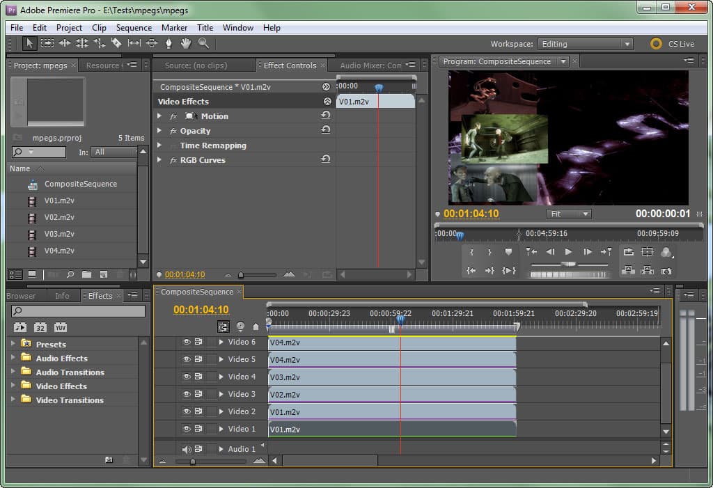Первый проект, который участвует в тестировании, является официальным проектом Adobe, предназначенным и рекомендованным бета-тестерам пакета CS5. Он представляет собой компиляцию из четырёх видеофайлов, уложенных на таймлинии в шесть слоёв, каждый из которых обильно снабжён фильтрами, поддерживаемыми аппаратно (т.е. обрабатываемыми движком Adobe Mercury Playback). Общая длительность проекта — 2 минуты. Видео, использованное в этом проекте, получено в результате 3D-рендеринга. Это AVCIntra P2 Movie — файлы с расширением *.MXF со следующими характеристиками: 1440x1080, глубина цвета 30 бит/пикс, частота кадров 23,976, битрейт 44 Мбит/сек, соотношение сторон 1,3333. AVCIntra означает, что в таком файле каждый кадр является I-кадром, то есть ключевым.