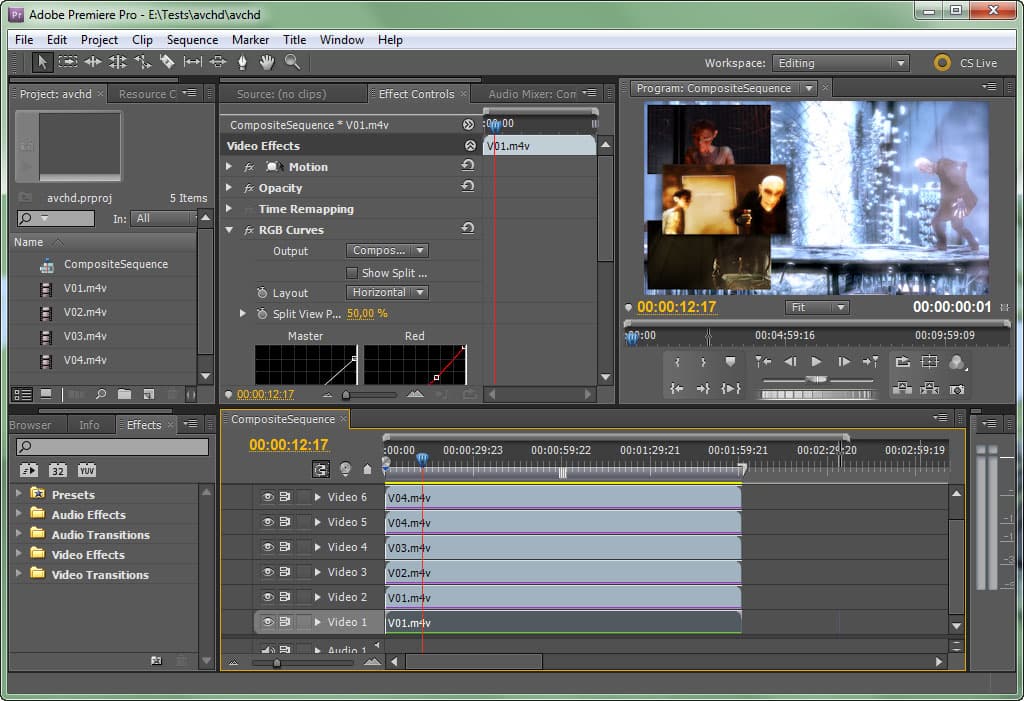 В "оригинальном" проекте используется видео AVC-Intra, имеющее довольно высокий битрейт (около 44 мбит/сек). Следовательно, во время проигрывания и/или просчёта такого проекта мы рискуем получить "тормоза" по причине непоспевания жёсткого диска — очень трудно, согласитесь, считывать с одного обыкновенного диска данные одновременно из четырёх разных файлов со скоростью 22 мегабайта в секунду (таков получается общий битрейт всех четырёх видеофайлов). Второй проект (с файлами MPEG-2) значительно уменьшит обращение к жёсткому диску, а также разгрузит и процессор, декодирующий видео — MPEG2 не отличается сильным сжатием. Последний же проект также не будет сильно тревожить диски, зато заставит прогреться электронные мозги, поскольку видео, сжатое в AVC — это довольно суровое испытание для вычислительных мощностей любого компьютера.
