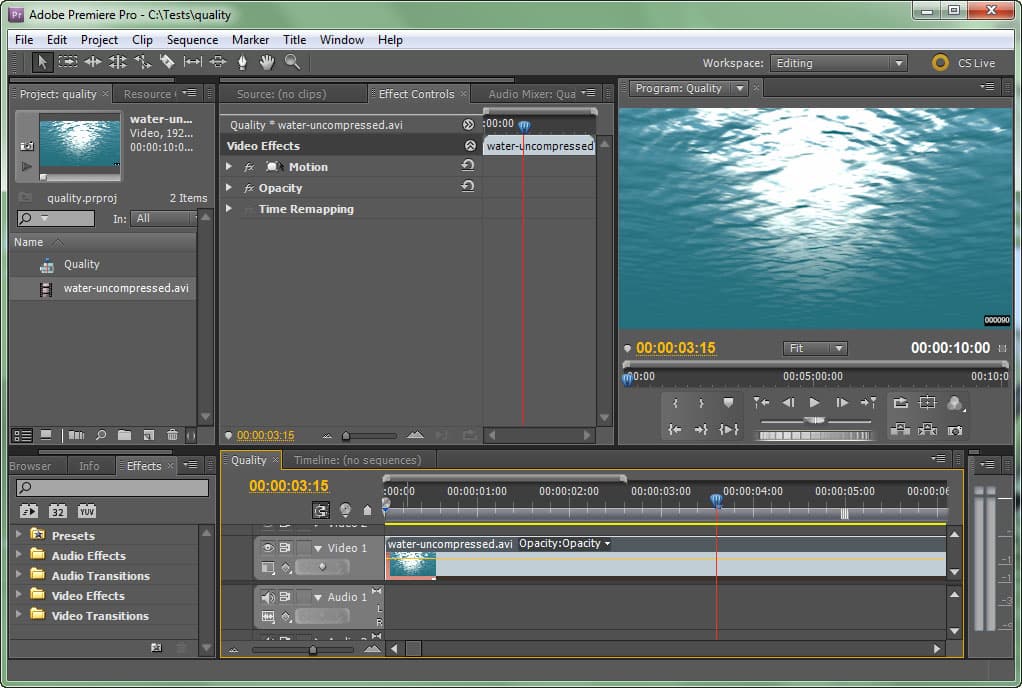 Для оценки качества кодирования воспользуемся специальной заготовкой: полуторагигабайтным видеофайлом-исходником с анимированной поверхностью воды (такие сложные объекты, как известно, довольно требовательны к методам сжатия и битрейту). Данный файл полностью лишён каких-либо артефактов сжатия, поскольку создан искусственно. Это десятисекундный AVI-uncompressed (без сжатия), 1920x1080 25p, и с глубиной цвета 32 бита на пиксель.