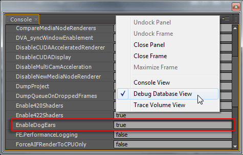 Теперь осталось настроить программу так, чтобы иметь возможность мониторить процесс проигрывания таймлинии, а именно — в реальном времени видеть FPS во время проигрывания, а также подсчитать количество пропущенных кадров. В командной консоли (Ctrl+F12) включим режим отладки базы данных (Debug Database View). Здесь в строке EnableDogEars необходимо активировать собачьи уши, напечатав слово true (dog ear — это идиома, обозначающая загнутый край книжной странички).