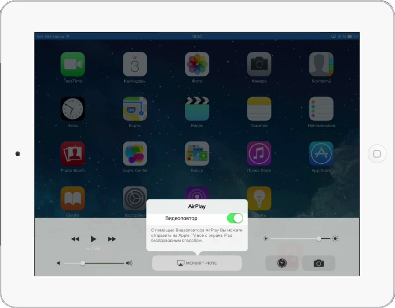 Небольшое отступление: для того, чтобы обеспечить вывод видеосигнала с дисплея iPad в устройство захвата (с тем, чтобы, например, создать скриншот или записать видео, не нагружая излишне процессор планшета), пришлось воспользоваться обходным путем. Который состоял в следующей программно-аппаратной цепочке: трансляция видеоповтора с iPad по Wi-Fi на устройство, эмулирующее AirPlay (ноутбук со специальным ПО) → трансляция видеосигнала с этого эмулятора по кабелю в устройство захвата → захват. Выглядит сложно, однако работает, и вполне успешно.