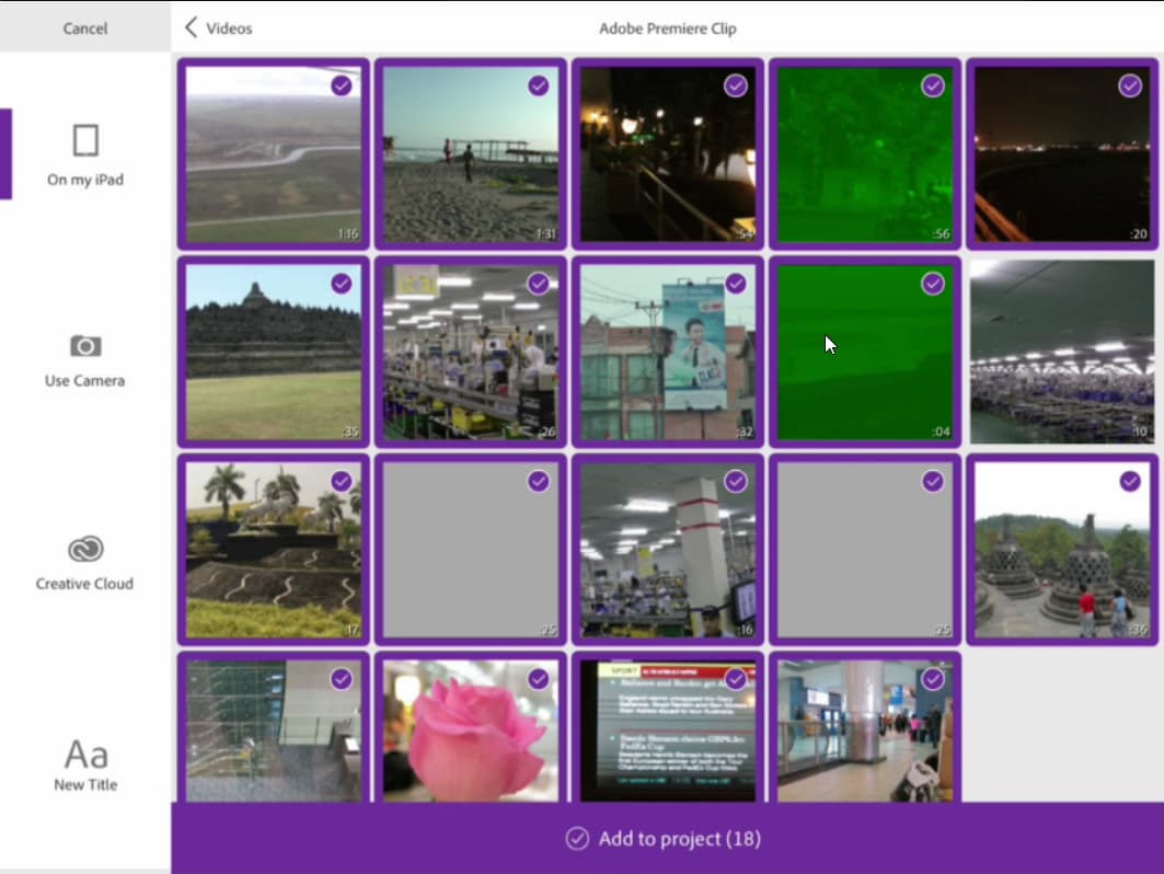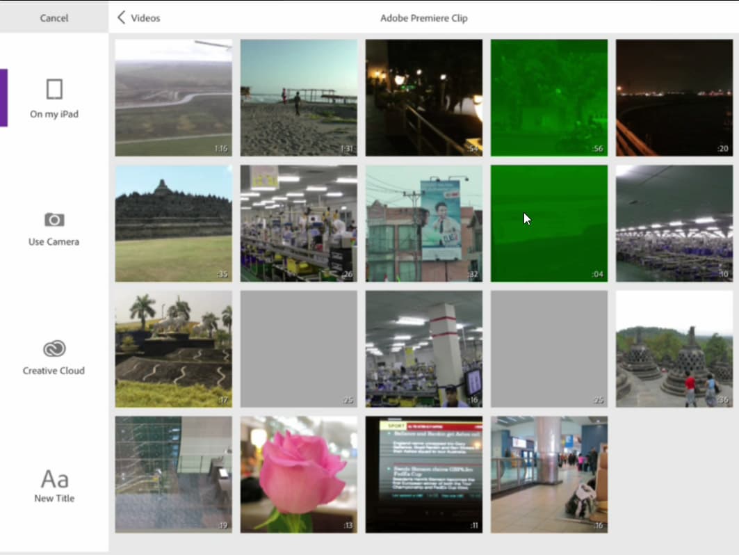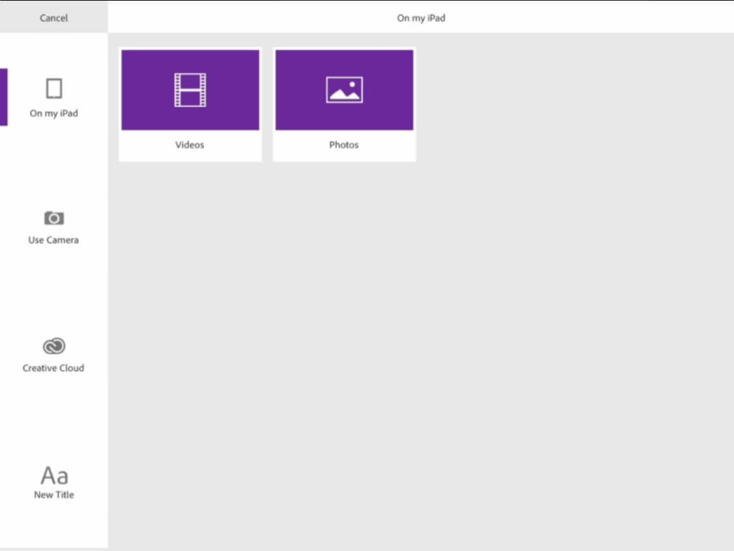 Теперь следующий логичный шаг — импортировать материал. Его можно забрать из внутренней памяти устройства, или произвести запись встроенной камерой, либо забрать из облака Creative Cloud. Оптимальным вариантом видится, конечно же, локальный импорт — но увы, iPad не поддерживает карты памяти (это выглядит, мягко говоря, чертовски странно для пользователя, привыкшего к работе с устройствами, предполагающими свободу создавать контент, а не только лишь потреблять его). Впрочем, справедливости ради, отметим, что способ расширить функциональность этого элитного устройства все же существует — это специальные переходники, или адаптеры. Они, конечно, далеко не бесплатны, но что ни сделаешь ради возможности творить?