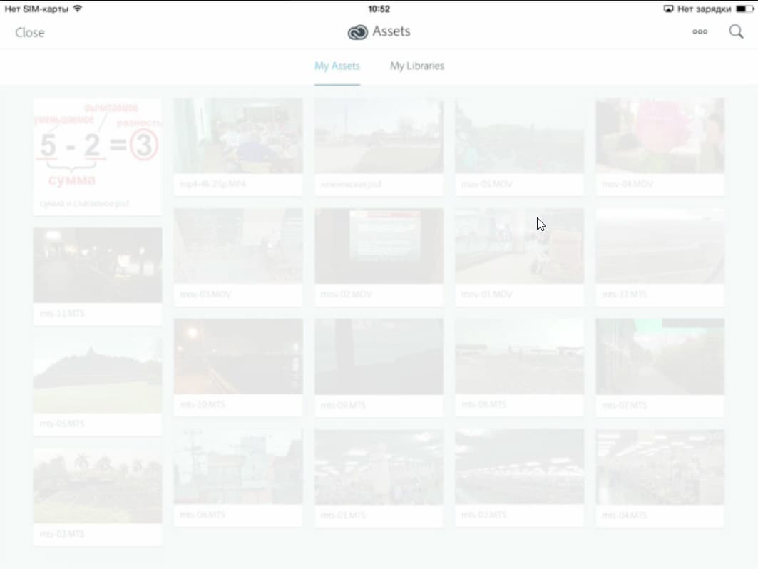 Не отходя от темы импорта видео в программу, взглянем на второй способ — импорт из Adobe Cloud. Кратко охарактеризуем этот способ: очень долго. Долго заливать в облако, и долго же оттуда скачивать (впрочем, если у пользователя нет проблем со свободным временем, то почему нет?). Второй недостаток: у нас этот способ так и не заработал. Файлы, находящиеся в облачном хранилище, успешно «увиделись» на iPad, причем увиделись все файлы, включая графические, загруженные давно ранее. Вот только эти файлы, вне зависимости от их формата, оказались почему-то неактивны, и ничего с ними поделать было нельзя.