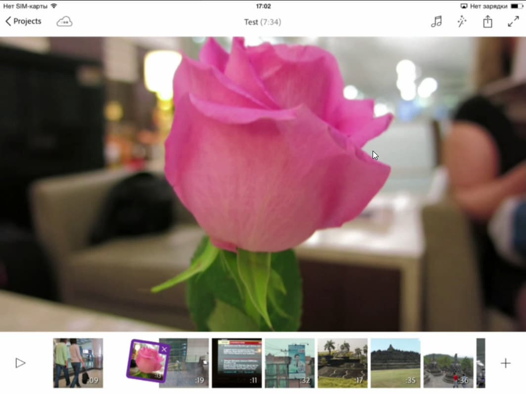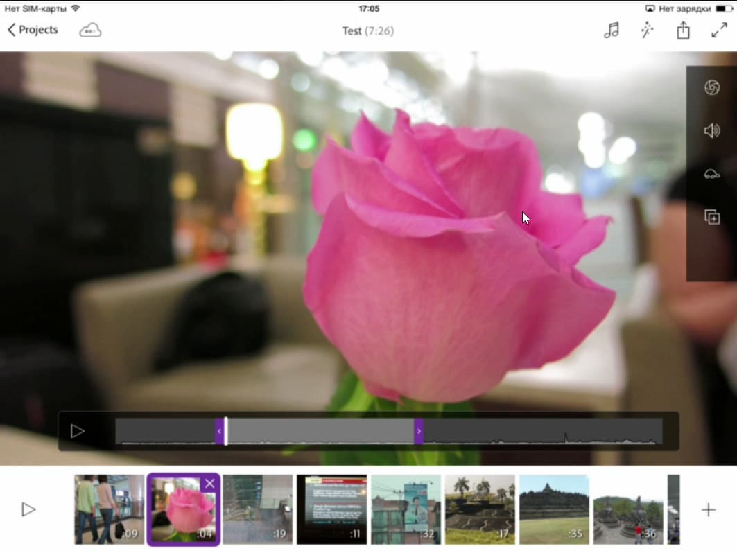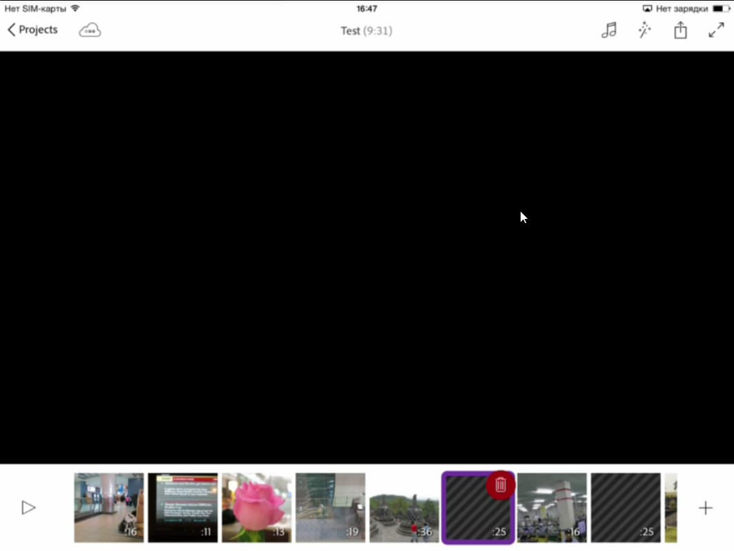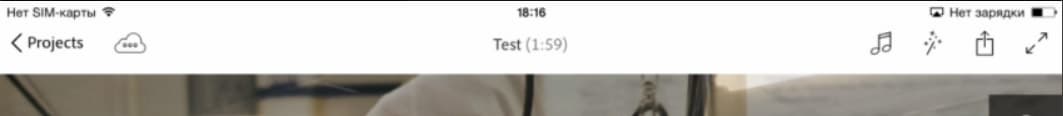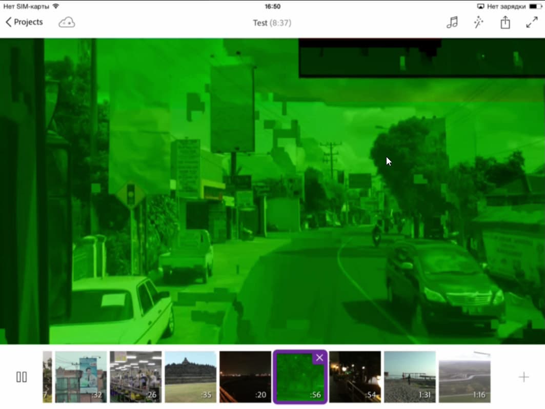 Кстати, во время работы стало понятно, почему некоторые импортированные в программу файлы оказались искаженно-зеленого цвета — это видео, в котором отсутствует звук. Помнится, похожие проблемы встречались нам при изучении видеомонтажных программ для системы Android. Приятно видеть что-то общее между этими двумя системами. Правда, в случае с Android такие файлы, не имеющие звуковой дорожки, попросту нельзя было импортировать в видеоредактор. А в iOS данные файлы хоть и импортируются, но выглядят вот так: