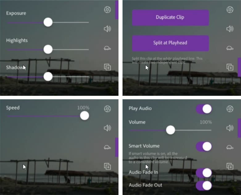 При монтаже имеется возможность использования нескольких наиболее распространенных инструментов, традиционно присутствующих в любой видеомонтажной программе, даже самой несложной. А именно: настройка экспозиции или изменение скорости воспроизведения клипа (к сожалению, здесь доступны только отрицательные значения, замедляющие видео, но не ускоряющие).