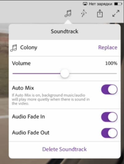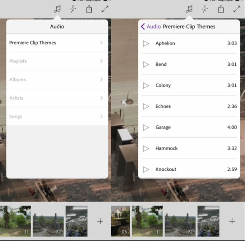 Наконец, о звуковом сопровождении фильма. Программа позволяет использовать для звуковой «подложки» не только аудиофайлы, имеющиеся в памяти устройства, но и входящие в коллекцию Adobe Premiere Clip. Прослушать их можно тут же, в списке выбора композиции.