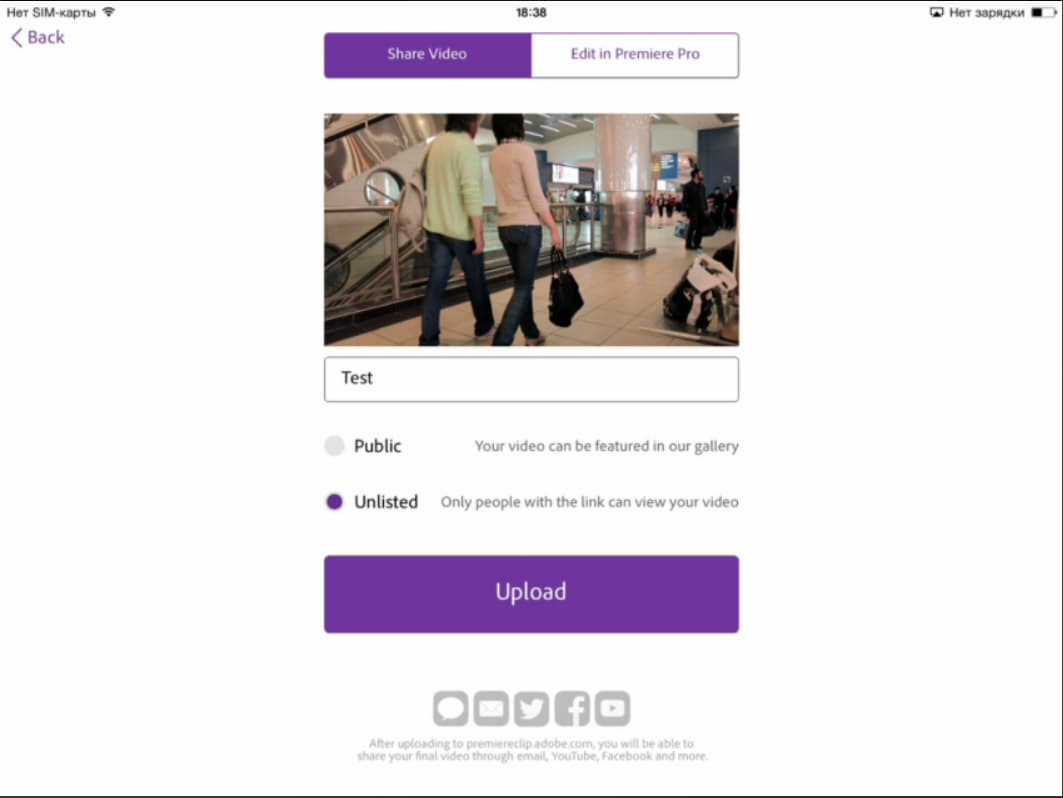 Вот теперь можно нажимать иконку, обозначающую экспорт проекта. На появившейся страничке можно видеть лишь два параметра: присвоение публичного или непубличного статуса, а также, что гораздо интереснее, возможность дальнейшего редактирования проекта в Premiere Pro. Той самой десктопной программе, старшем брате — точнее, дедушке — рассматриваемого мобильного приложения.