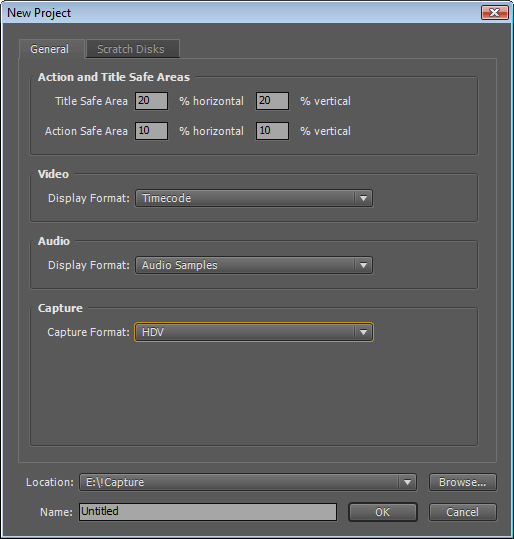 Новшества, появившиеся в версии CS4, встречают нас сразу — стоит лишь запустить программу. Любая работа Premiere Pro, как всегда, начинается с создания проекта. Теперь рождение нового проекта состоит более чем из одного шага. Во-первых, необходимо определиться с такими параметрами проекта, как границы зон безопасности, формат захвата и место хранения файлов проекта (захваченное видео-аудио, временные файлы).