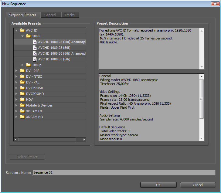 Как видно на рисунке, Adobe Premiere Pro "понимает" великое множество форматов. Что примечательно — теперь эти настройки касаются не всего проекта в целом, а лишь той секвенции (таймлинии), к которой они относятся. Таким образом, логика работы в программе стала ближе к положению дел в After Effects — там таким же образом в одном проекте могут сосуществовать таймлинии с разными настройками и совершенно разным по своим параметрам содержимым.