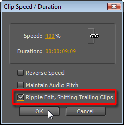 Ripple Edit, Shifting Trailing Clips — если отметить этот пункт флажком, то теперь при изменении длительности клипа весь остальной материал, расположенный на таймлинии справа от клипа, автоматически сдвинется влево, если клип был ускорен, или вправо, если клип был замедлен. Нельзя не признать — это крайне полезная опция, которой всегда не хватало, ведь клипы с измененной продолжительностью имели обыкновение накладываться друг на друга без всякого сдвига или, наоборот, создавались пробелы на таймлинии.