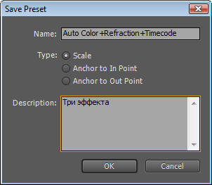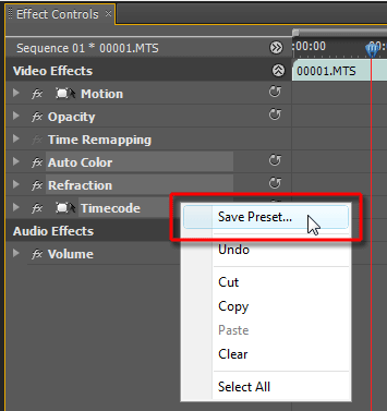 Чтобы создать такой шаблон из примененных к клипу фильтров, необходимо, удерживая Ctrl, выделить необходимые фильтры в окне Effect Controls, и выбрать из выпадающего меню команду Save Preset.