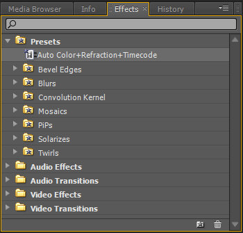 Готово, новый шаблон появился в списке эффектов панели Effects. Теперь работа пойдет быстрее, ведь отпадает необходимость каждый раз создавать один и тот же набор эффектов.