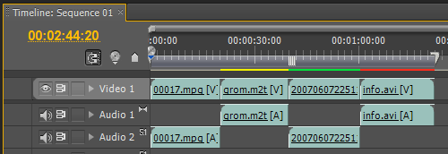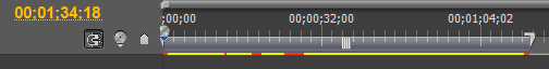 Отсутствие какой-либо цветной полоски над клипом означает полное совпадение параметров клипа с параметрами таймлинии (секвенции), желтой полосой отмечаются клипы, которые программа в состоянии воспроизвести без предварительного просчета, зеленый цвет сигнализирует о том, что данный кусок уже просчитан, а красным отображается материал, который не может быть воспроизведен в реальном времени без "дропов" (пропусков кадров), и нуждается в просчете.