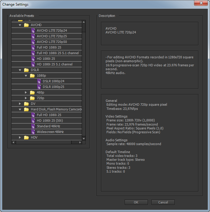 Что-ж, придётся работать с имеющимся 1080 50p видео, пользуясь шаблоном, характеристики которого наиболее близки к нужным параметрам — это 1080 25p (видео с фотоаппаратов, раздел DSLR в главном списке пресетов). Правда, при этом таймлиния украсится сверху красной полоской, означающей в Premiere (как в Pro, так и в Elements) только одно: формат видео не соответствует формату проекта, и, следовательно, программа не обещает плавное воспроизведение такого видео на таймлинии во время монтажа.