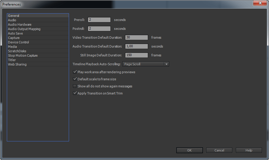 Неоднократное сравнение рассматриваемой программы с более продвинутой версией — Adobe Premiere Pro — заставляют проводить аналогии и дальше. Так, настройки Premiere Elements во многом напоминают настройки старшего брата, Premiere Pro. Здесь присутствуют характерные для профессионального видеоредактора параметры, такие как изменение длительности видео- и аудиопереходов, а также импортируемых графических файлов. Имеется возможность задания пользовательских путей к временным файлам программы: пункт Scratch Disks. Также довольно ценный инструмент, поскольку грамотное размещение временных файлов иногда позволяет ощутимо увеличить комфорт монтажа.