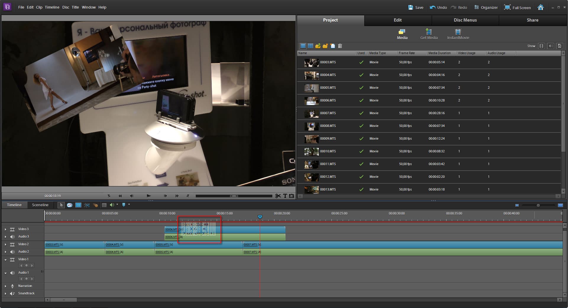 Правда, это слабое утешение — ведь и на большом экране видео так же дёргается и застревает, не давая возможности вести полноценный монтаж. С более легковесными форматами дело обстоит куда как проще: к примеру, монтаж старого древнего AVI DV или MPEG-2 не доставляет никаких хлопот, хоть в пять слоёв видео укладывай и трансформируй — задержки при воспроизведении такой сложной таймлинии практически отсутствуют (правда, ПК, на котором производилась работа, нельзя назвать слабеньким или даже «средненьким»: Core i7 870, 8 ГБ DDR3, NVIDIA GTX 460, системный диск — SSD Intel X25-M).