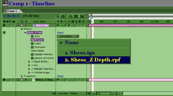 Теперь нужно положить оба изображения на Timeline в АЕ и к полноцветной картинке применить фильтр Depth of Field, в параметре depth layer указав название изображения с Z-buffer,