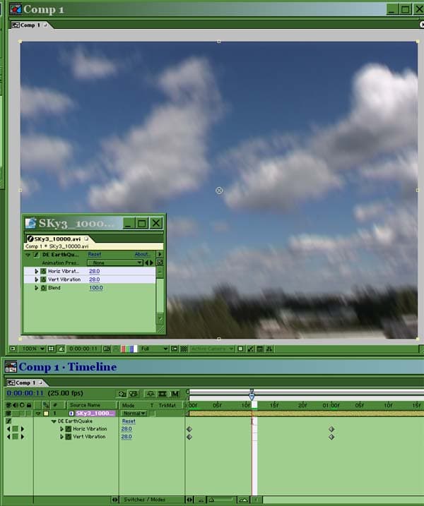 Из группы DE Aurorix интересен в практическом использовании фильтр DE Earth Quake. Этот эффект позволяет имитировать дрожание камеры при раздавшемся неподалёку взрыве и усиливает визуальное восприятие съёмки, если в ней присутствует сильный удар, хлопок или просто если что-то с грохотом падает. Содержит всего три настройки.