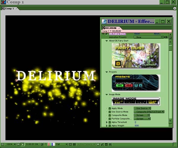 DE Fairy Dust, DE Fire и DE Smoke генерируют облако цветных частиц-звёздочек, огонь и дым соответственно. Эти эффекты могут генерироваться из точки, снизу слоя, а также на основе информации о яркости или Альфа-канале видео. Каждый генератор содержит довольно много настраиваемых параметров, позволяющих управлять детализацией физических явлений, воздействием ветра, продолжительностью «жизни» и т.д.