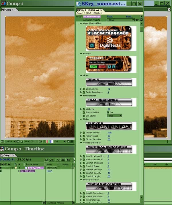 В группе Cinelook есть фильтр DE Film Damage, помогающий превратить видео в старую киноплёнку и добавить к изображению цветовой тон, пыль, зерно, вертикальные полосы и горизонтальные помехи, расфокусировку и т.д. Количество настраиваемых параметров огромно, но при минимальном знании английского языка разобраться довольно просто.