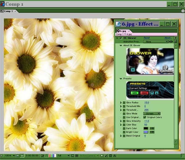 Группа DE Delirium, пожалуй, наиболее известна и представляет особый интерес. DE Glow даёт очень качественный эффект свечения. Прекрасные результаты получаются, если продублировать слой, к верхнему применить способ наложения Pin Light и к нему же применить фильтр DE Glow с параметрами Glow radius и Glow Intensity в пределах 10-15.