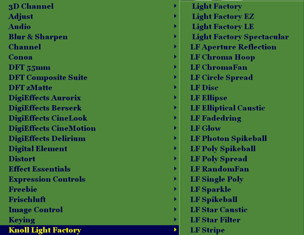 Knoll Light Factory – генерируемые с помощью этого модуля блики призваны имитировать так называемые линзовые эффекты (Lens Effects) – всевозможные вспышки и сполохи, возникающие при съёмке блестящих объектов. Довольно большая группа эффектов.
