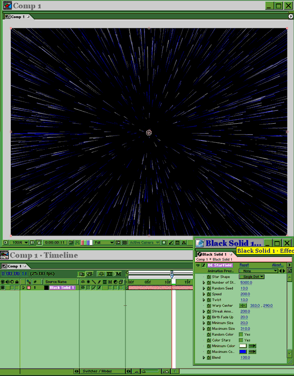 Раздел DE Berserk содержит некоторые фильтры, схожие по действию с группой Stylize из набора стандартных эффектов АЕ и помогает превратить изображение, например, в напечатанную газетной печатью фотографию (DE Newsp rint) или имитирует рисунок маслом (DE Oilpaint). Генератор DE Starfield, как следует из названия, создаёт звёздное небо с различными параметрами, допускающими анимацию, и разными типами звёзд. Кроме того, можно создать довольно эффектный «полёт» через звёзды с поворотом камеры, различной скоростью и длиной хвостов, оставляемых звёздами.