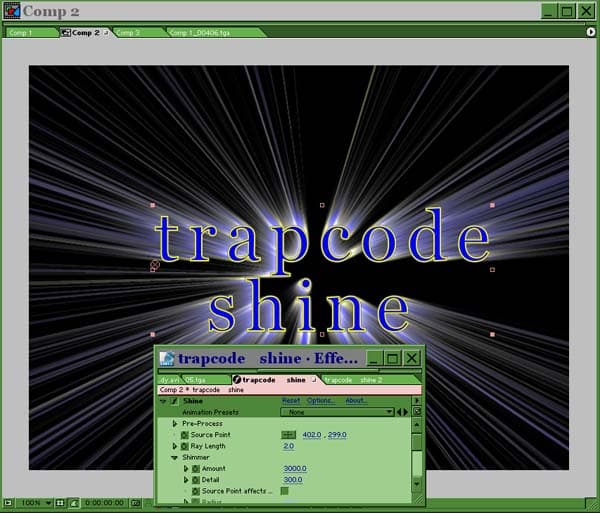 В принципе, очень похожий эффект дают плагины Light Zoom от DE Aurorix и Light Burst от Final Effects, но во-первых, Trupcode Shine имеет большее количество настроек, а во-вторых, последний фильтр считается раза в четыре быстрее, чем два упомянутых эффекта.