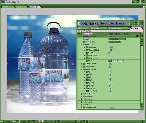 Разумеется, все параметры анимируемы – длина лучей, их цвет, дополнительное свечение, центр схода лучей и т.д. С помощью группы настроек Shimmer можно заставить лучи переливаться, создавая впечатление расходящегося света, даже если на самом деле в кадре нет никакого движения. Очевидно, что использование этого фильтра не ограничивается применением к изображению на Альфа канале, как показано на примере. При грамотном использовании можно добиться довольно зрелищной картины, имитируя в отснятом материале солнечные лучи, пробивающиеся сквозь листву, облака или толщу воды.