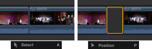 Если поместить клип на таймлинию посредством стандартной «стрелки» Select, то этот клип прилипнет к предыдущему. Если же воспользоваться инструментом Position, то клип останется там, куда его поместил монтажер. При этом между клипами образуется некий пустой объект, Gap. По сути этот объект представляет собой заливку чёрного цвета, а работать с ним можно точно так же, как и с обычными клипами — подреза́ть, перемещать.