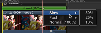 Думается, почти все эти команды будут понятны любому, кто имел дело с монтажом. Но всё же хотелось бы узнать некоторые подробности касательно функции Retime. Эта команда присоединяет к редактируемому клипу или клипам «шапку» с надписью Retiming. Здесь имеется выпадающий список, из которого можно выбрать несколько стандартных предустановок замедления или ускорения клипа. К сожалению, ввод пользовательских значений (процентов ускорения или замедления) данным инструментом не предусматривается, замедлить клип разрешается до x10, а ускорить — до x20.