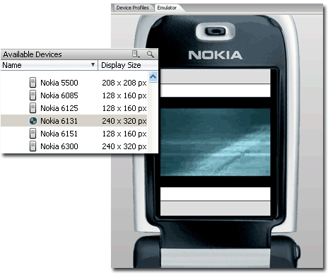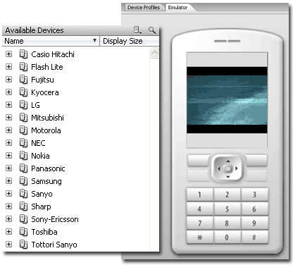 Новый модуль Adobe Device Central CS3 предназначен для предварительного просмотра контента на экранах портативных устройств и содержит большое количество профилей. Пользователь имеет возможность мгновенно увидеть конечный результат экспорта видео непосредственно "на экране" того устройства, для которого данный клип создавался. Конечно речь идет всего лишь об эмуляции такого просмотра, но, как бы то ни было, вы можете видеть клип, проигрывающийся на конкретной модели мобильного телефона. При этом сохраняется точное соотношение сторон видео, что так критично для каждого мобильного устройства в отдельности.