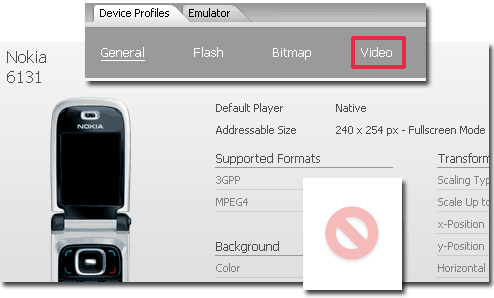 Если на псевдо-экране выбранного устройства вдруг появился красный перечеркнутый круг, это значит, что выбранная модель не поддерживает созданное вами видео. Беда? Ничего страшного, переключитесь на закладку Device Profiles, и зайдите в раздел Video. Здесь вы найдете исчерпывающую информацию о разрешении экрана выбранного телефона, поддерживаемых им форматах видео и т.д. Остается лишь запомнить эту информацию, и в будущем создавать клипы с такими же характеристиками.