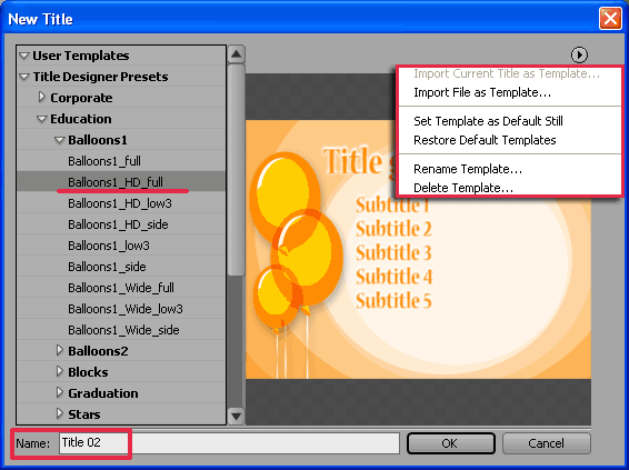 Обновлена библиотека шаблонов титров, находящихся во встроенном титровальщике (Title>New Title>Based on Template). Слегка изменен дизайн палитры New Title, например, внизу окна появилось поле для ввода имени выбираемого шаблона титров. В предыдущей версии программы при выборе шаблона титра, ему автоматически присваивалось имя выбранного шаблона. В версии Adobe Premiere Pro CS3 выбранному шаблону автоматически присваивается порядковый номер титра: Title 01, Title 02, Title 03...