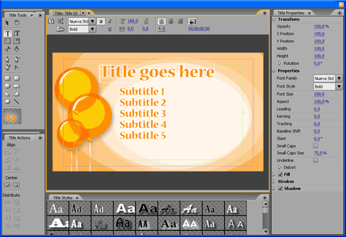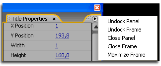 При нажатии кнопки с треугольником, находящейся в правом верхнем углу окна, выпадает список управления палитрой Title Properties (эти кнопки добавлены к каждой палитре, находящейся в окне по работе с титрами). Пять пунктов, связанных с обводкой Stroke, были упразднены.