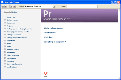 При выполнении команды Help>Adobe Premiere Pro Help (F1), запустится новый сервис Adobe Help Viewer. Это новая справочная система, созданная специально для линейки продуктов CS3. Для некоторых продуктов есть прямые ссылки на видеоуроки, опубликованные на сайте adobe.com, — справка становится более интерактивной.