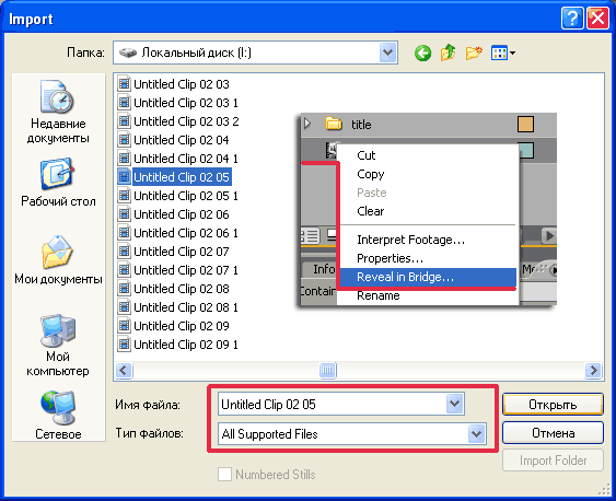 При импорте контента (Ctrl+I) зачастую трудно выбрать необходимый файл из большого списка в окне Import. Изменена длина полей в окне Import: Имя файла и Тип файлов. Чтобы попасть в папку, из которой был импортирован файл, нажмите на нем правую кнопку мыши в списке панели проекта и выберите команду Reveal in Bridge.