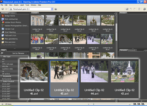 При щелчке мышью по любому файлу немедленно начнется его воспроизведение, а значок этого файла будет обрамлен синей каймой. Для открытия выбранного файла в программе Adobe Premiere Pro CS3 следует нажать клавишу Enter, или произвести двойной клик мышью. Появилась возможность просмотра видеофайлов формата FLV, SWF.