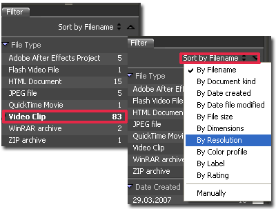 Новая палитра Filter поможет выбрать из большого разнообразия форматов файлов самое необходимое. Можно сортировать файлы по таким параметрам, как имя, дата создания/изменения, размер и т.д.